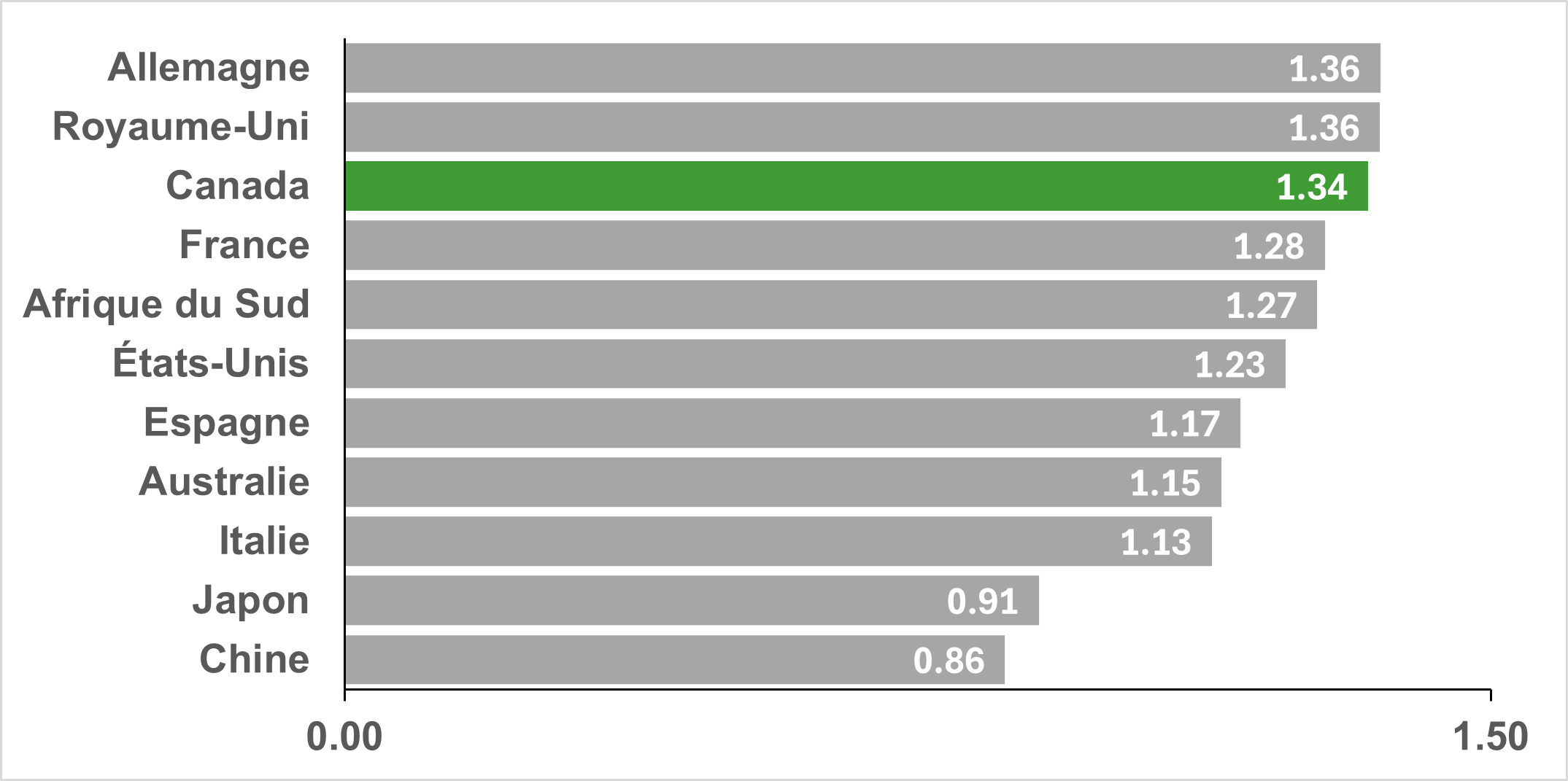 Figure 4 : Classement des dix premiers pays selon la moyenne des citations relatives (MCR) des publications, tous domaines liés aux ITSS confondus (2004-2022)