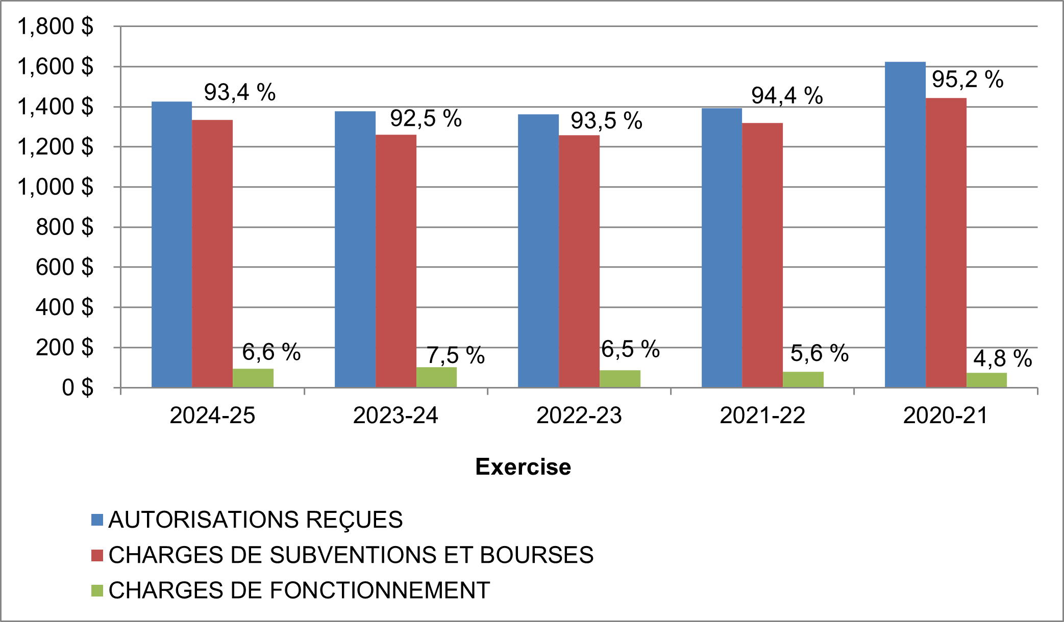2025 2024 Autorisations fournies : Crédit 1 – Dépenses de fonctionnement 78 864 $ 82 970 $ Crédit 5 – Subventions 1 336 871 1 283 480 Montants législatifs 9 896 10 183 Moins : Autorisations bloquées (8) (26 566) Autorisations disponibles pour emploi au cours des exercices ultérieurs (601) (599) Périmés : fonctionnement - (450) Périmés : subventions (649) (561) Autorisations de l'exercice en cours utilisées 1 424 373 $ 1 348 457 $